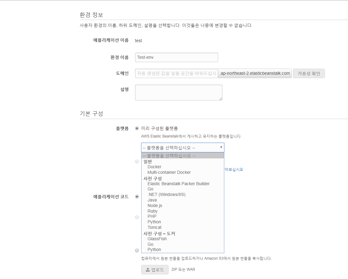 환경 티어 - 웹서버 환경 선택 - 플랫폼(맞는 환경 선택) - 소스 업로드(해도되고 안해도 됨)