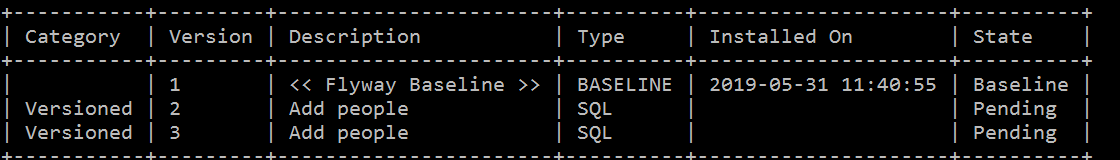 flyway info - DB에 적용된 스키마 정보와, 로컬에 pending 되어있는 변경 정보를 보여준다.